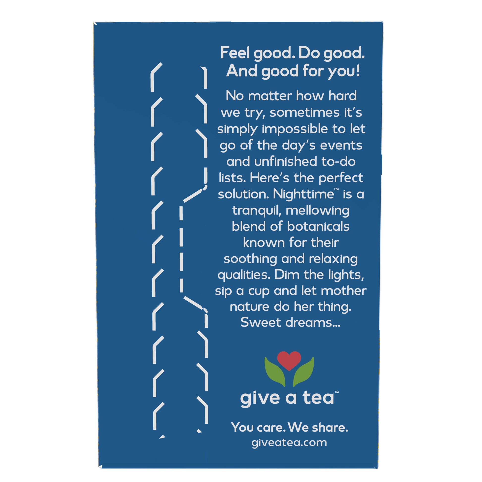 Não importa o quanto tentemos, às vezes é simplesmente impossível deixar de lado os eventos do dia e as listas de tarefas inacabadas. Aqui está a solução perfeita. Nighttime é uma mistura tranquila e suave de plantas botânicas conhecidas por suas qualidades calmantes e relaxantes. Diminua as luzes, beba uma xícara e deixe a mãe natureza fazer o que ela quer. Bons Sonhos...